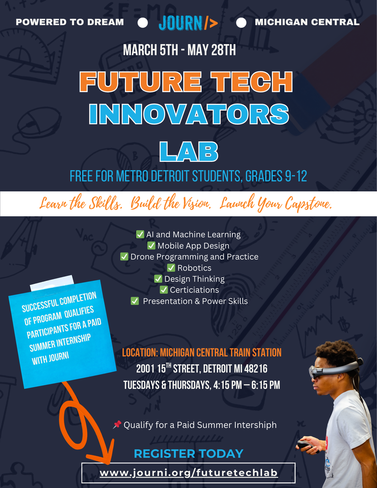 Future Tech Innovators Lab is a 12-week hands-on STEM and entrepreneurship program for Detroit high school students. Participants explore Artificial Intelligence, Machine Learning, Drones, Robotics, and 3D Printing while building leadership and professional skills. Students engage in real-world projects, connect with industry professionals and gain exposure to high-growth tech careers.