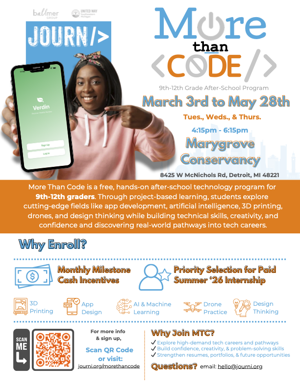 More Than Code is a free, hands-on after-school technology program for 9th–12th graders. Through project-based learning, students explore cutting-edge fields like app development, artificial intelligence, 3D printing, drones, and design thinking while building technical skills, creativity, and confidence—and discovering real-world pathways into tech careers.